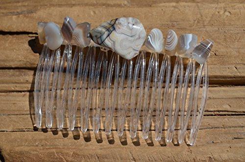 Attractive gray banded agate hair comb. The gray banded agate stone hair comb is adorned with small tumbled gray banded agate stones. The gray banded agate hair comb is the perfect accessory to a night out, and can dress up an outfit or be used for a special event, like a quinceanera, first communion, or even a wedding. The hair comb is hand made in the USA and come from a smoke free environment The gray banded agate hair comb measures: 67 mm x 41 mm or 2.65 inches x 1.6 inches AGATE Stone Name: Agate Stone Specifics: Stone of Personal Precision Stone Color: Patterned Stone Origin: In ancient texts tell us that Agate was highly valued as a talisman or amulet, it was told to be able to quench ones thirst as well as protect from fevers; there are even legends that tell us that Persian magicians used Agate to divert unwanted storms. Hardness: 7 Magical Powers: ~ Enhances perceptiveness ~ Stimulates general analytical capacity ~ Provides balance between physical, intellectual and spiritual states ~ Promotes goodwill ~ Alleviates hostilities ~ Improves memory and concentration ~ Increases stamina ~ Assists in discerning the truth ~ Encourages honesty ~ Enhances personal courage ~ Protects against danger ~ Provides a calming influence. Element: Water Chakras: Throat (5th) Composition: Silicon Dioxide _____